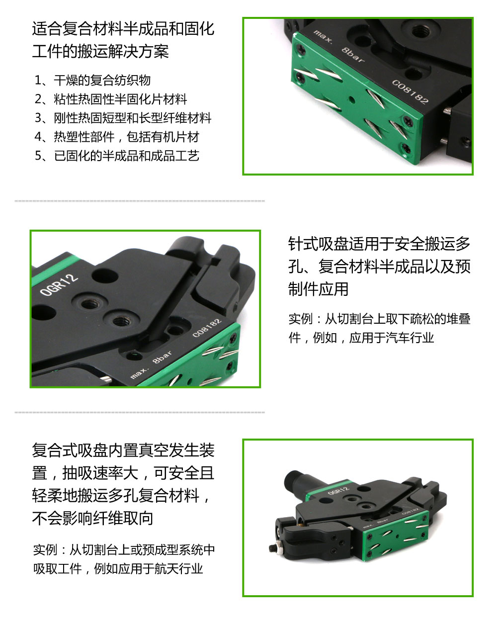 产品介绍:1、针式吸盘适用于安全搬运多空、复合材料半成品以及预制件应用;2、复合式吸盘内置真空发生装置,抽吸率大,可安全且轻柔地搬运多孔复合材料,不会影响纤维取向。
